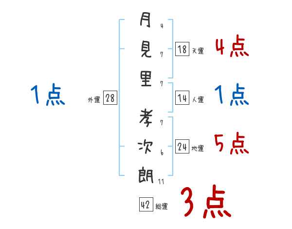 天運![]() | 月見里孝次朗さんの天運は18画の4つ星!情熱的で剛気。忍耐力があり信頼される。 家系が持つ宿命的な運勢を表します。祖先から受け継いだ苗字ですので自分の力が及びません。家柄を象徴します。 |