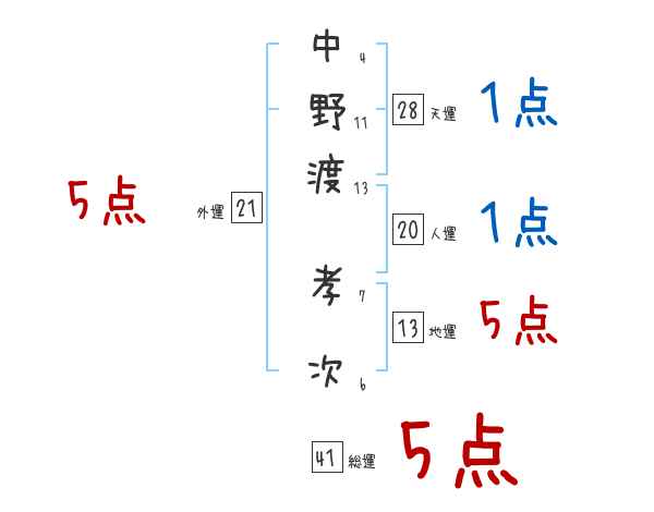 天運![]() | 中野渡孝次さんの天運は28画の1つ星!家庭環境に注意。スポーツで活躍できる能力があるかも。 家系が持つ宿命的な運勢を表します。祖先から受け継いだ苗字ですので自分の力が及びません。家柄を象徴します。 |