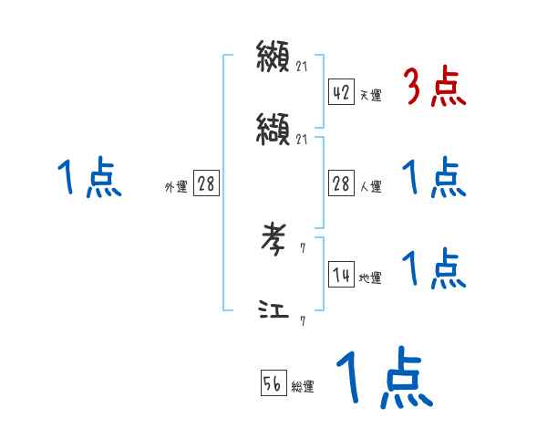 天運![]() | 纐纈孝江さんの天運は42画の3つ星!病気に注意。多芸であるが消極的でおとなしい。 家系が持つ宿命的な運勢を表します。祖先から受け継いだ苗字ですので自分の力が及びません。家柄を象徴します。 |
