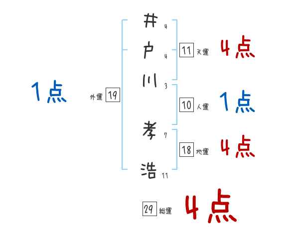 天運![]() | 井戸川孝浩さんの天運は11画の4つ星!着実に富や地位を得る幸運な人生。 家系が持つ宿命的な運勢を表します。祖先から受け継いだ苗字ですので自分の力が及びません。家柄を象徴します。 |