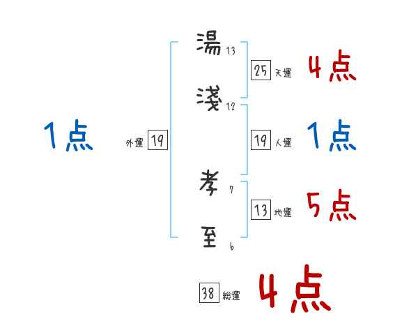 外運![]() | 湯淺孝至さんの外運は19画の1つ星!優れた才能を持ちますが、協調性が足りないことも。周りの人と協力する事を意識しましょう。 生活面を象徴する運勢です。外部から受ける影響力を表し、結婚運、家庭運や職場、環境への順応性を表します。 |