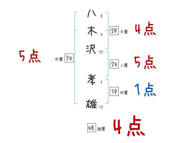 天運![]() | 八木沢孝雄さんの天運は29画の4つ星!完全主義で才能がある。厳格な心の持ち主。 家系が持つ宿命的な運勢を表します。祖先から受け継いだ苗字ですので自分の力が及びません。家柄を象徴します。 |