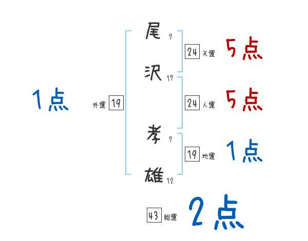 天運![]() | 尾沢孝雄さんの天運は24画の5つ星!家庭運が良く順調な人生。金運にも恵まれる。 家系が持つ宿命的な運勢を表します。祖先から受け継いだ苗字ですので自分の力が及びません。家柄を象徴します。 |