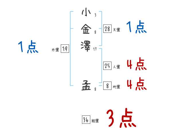 天運![]() | 小金澤孟さんの天運は28画の1つ星!家庭環境に注意。スポーツで活躍できる能力があるかも。 家系が持つ宿命的な運勢を表します。祖先から受け継いだ苗字ですので自分の力が及びません。家柄を象徴します。 |