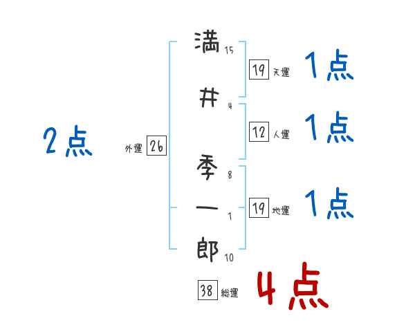 外運![]() | 満井季一郎さんの外運は26画の2つ星!波瀾万丈かも。信頼できる人を大事にしましょう。 生活面を象徴する運勢です。外部から受ける影響力を表し、結婚運、家庭運や職場、環境への順応性を表します。 |