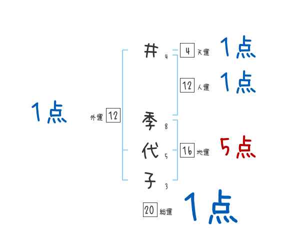 天運![]() | 井季代子さんの天運は4画の1つ星!感情が不安定で苦労するかも。周囲との協調を心掛けましょう。 家系が持つ宿命的な運勢を表します。祖先から受け継いだ苗字ですので自分の力が及びません。家柄を象徴します。 |