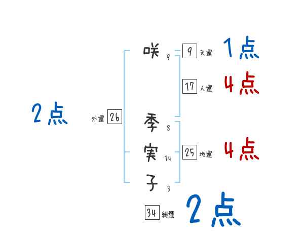 天運![]() | 咲季実子さんの天運は9画の1つ星!消極的で才能を発揮することが苦手なことも。周りの意見に耳を傾けましょう。 家系が持つ宿命的な運勢を表します。祖先から受け継いだ苗字ですので自分の力が及びません。家柄を象徴します。 |