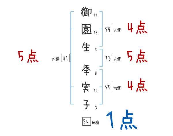 外運![]() | 御園生季実子さんの外運は41画の5つ星!大志を抱き、目標に向かって実力を発揮し達成する。温和な性格。 生活面を象徴する運勢です。外部から受ける影響力を表し、結婚運、家庭運や職場、環境への順応性を表します。 |
