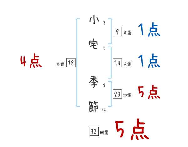 総運![]() | 小宅季節さんの総運は32画の5つ星!柔軟性があり成功する。チャンスが多く金運が良い。 あなたの人生を表す1番重要な運勢です。生涯を通じて影響する総合運となり、主に50歳以降の晩年期に影響を及ぼします。 |
