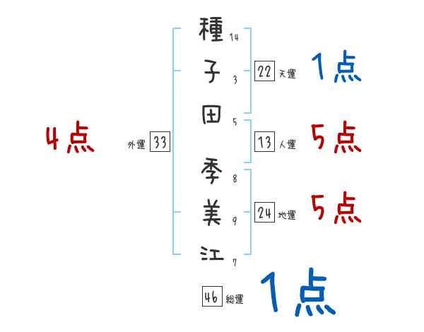 総運![]() | 種子田季美江さんの総運は46画の1つ星!迷走することが多く苦労するかも。目先のことにとらわれないように。 あなたの人生を表す1番重要な運勢です。生涯を通じて影響する総合運となり、主に50歳以降の晩年期に影響を及ぼします。 |