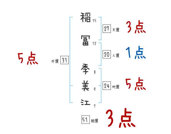総運![]() | 稲冨季美江さんの総運は51画の3つ星!変化が激しく、危険に注意。堅実な性格。 あなたの人生を表す1番重要な運勢です。生涯を通じて影響する総合運となり、主に50歳以降の晩年期に影響を及ぼします。 |