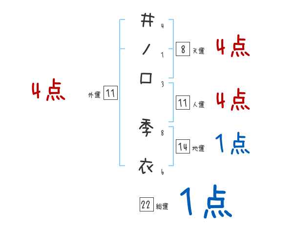 総運![]() | 井ノ口季衣さんの総運は22画の1つ星!努力することが苦手ないっぽう手先が器用。芸術性にも優れる。 あなたの人生を表す1番重要な運勢です。生涯を通じて影響する総合運となり、主に50歳以降の晩年期に影響を及ぼします。 |