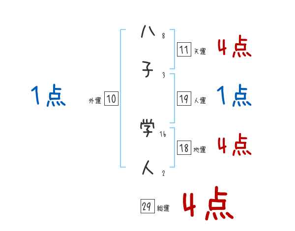 人運![]() | 八子学人さんの人運は19画の1つ星!優れた才能を持ちますが、協調性が足りないことも。周りの人と協力する事を意識しましょう。 性格や才能などを表す2番目に重要な運勢です。人間関係や協調性、社会的な成功に影響します。主に20歳から50歳ぐらいまでの中年期の運勢を表します。 |