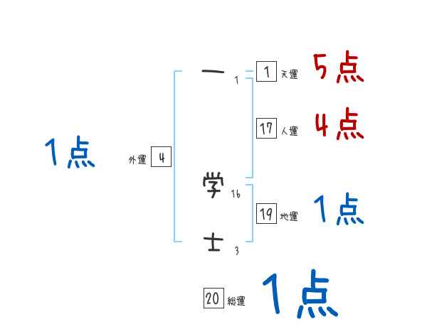 天運![]() | 一学士さんの天運は1画の5つ星!行動力、指導力があり出世し繁栄する。幸運に恵まれる。 家系が持つ宿命的な運勢を表します。祖先から受け継いだ苗字ですので自分の力が及びません。家柄を象徴します。 |