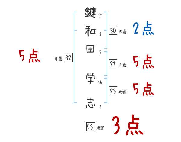 外運![]() | 鍵和田学志さんの外運は32画の5つ星!柔軟性があり成功する。チャンスが多く金運が良い。 生活面を象徴する運勢です。外部から受ける影響力を表し、結婚運、家庭運や職場、環境への順応性を表します。 |