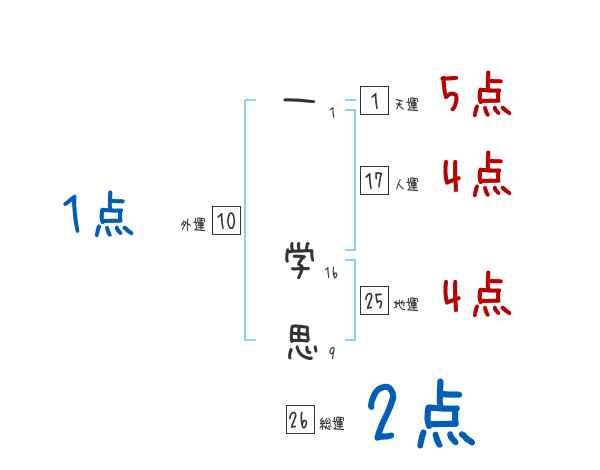総運![]() | 一学思さんの総運は26画の2つ星!波瀾万丈かも。信頼できる人を大事にしましょう。 あなたの人生を表す1番重要な運勢です。生涯を通じて影響する総合運となり、主に50歳以降の晩年期に影響を及ぼします。 |