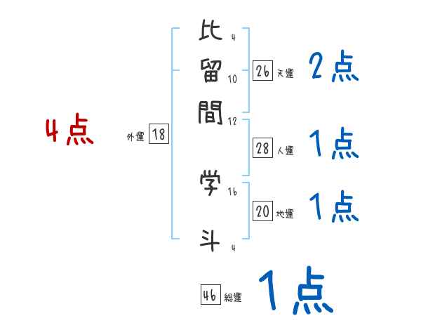 総運![]() | 比留間学斗さんの総運は46画の1つ星!迷走することが多く苦労するかも。目先のことにとらわれないように。 あなたの人生を表す1番重要な運勢です。生涯を通じて影響する総合運となり、主に50歳以降の晩年期に影響を及ぼします。 |