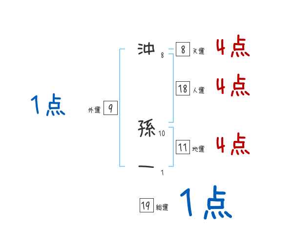 天運![]() | 沖孫一さんの天運は8画の4つ星!勤勉家。根気強く努力し成功する。忍耐力がある。 家系が持つ宿命的な運勢を表します。祖先から受け継いだ苗字ですので自分の力が及びません。家柄を象徴します。 |