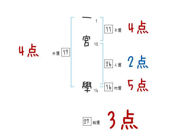 外運![]() | 一宮學さんの外運は17画の4つ星!積極的な行動力。地位を気づき財産を手に入れる。純粋な心と直感力。 生活面を象徴する運勢です。外部から受ける影響力を表し、結婚運、家庭運や職場、環境への順応性を表します。 |