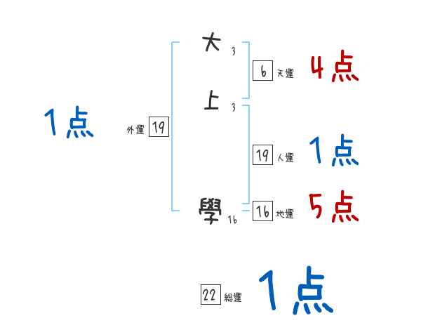 総運![]() | 大上學さんの総運は22画の1つ星!努力することが苦手ないっぽう手先が器用。芸術性にも優れる。 あなたの人生を表す1番重要な運勢です。生涯を通じて影響する総合運となり、主に50歳以降の晩年期に影響を及ぼします。 |