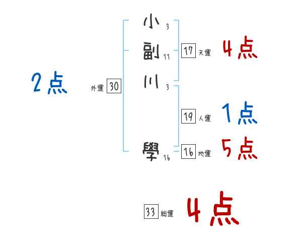 総運![]() | 小副川學さんの総運は33画の4つ星!権力志向でプライドが高い。勇気があり運を切り開き成功する。 あなたの人生を表す1番重要な運勢です。生涯を通じて影響する総合運となり、主に50歳以降の晩年期に影響を及ぼします。 |