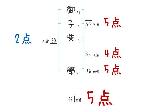 総運![]() | 御子柴學さんの総運は39画の5つ星!社交性に優れ人望が厚い。人の上に立ち成功する。 あなたの人生を表す1番重要な運勢です。生涯を通じて影響する総合運となり、主に50歳以降の晩年期に影響を及ぼします。 |