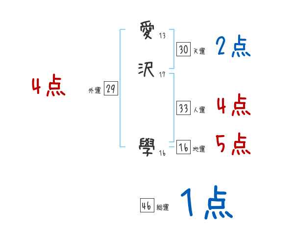 外運![]() | 愛沢學さんの外運は29画の4つ星!完全主義で才能がある。厳格な心の持ち主。 生活面を象徴する運勢です。外部から受ける影響力を表し、結婚運、家庭運や職場、環境への順応性を表します。 |