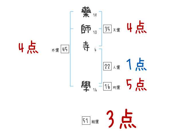 天運![]() | 藥師寺學さんの天運は35画の4つ星!温厚な性格で感受性が高い。穏和な性格で人望が厚い。 家系が持つ宿命的な運勢を表します。祖先から受け継いだ苗字ですので自分の力が及びません。家柄を象徴します。 |