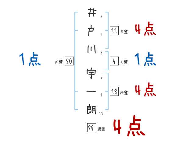 天運![]() | 井戸川宇一朗さんの天運は11画の4つ星!着実に富や地位を得る幸運な人生。 家系が持つ宿命的な運勢を表します。祖先から受け継いだ苗字ですので自分の力が及びません。家柄を象徴します。 |