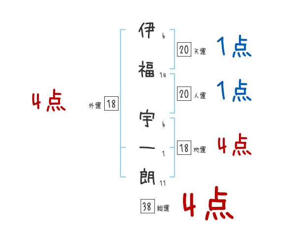 外運![]() | 伊福宇一朗さんの外運は18画の4つ星!情熱的で剛気。忍耐力があり信頼される。 生活面を象徴する運勢です。外部から受ける影響力を表し、結婚運、家庭運や職場、環境への順応性を表します。 |