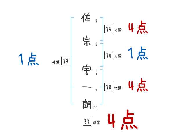 外運![]() | 佐宗宇一朗さんの外運は19画の1つ星!優れた才能を持ちますが、協調性が足りないことも。周りの人と協力する事を意識しましょう。 生活面を象徴する運勢です。外部から受ける影響力を表し、結婚運、家庭運や職場、環境への順応性を表します。 |