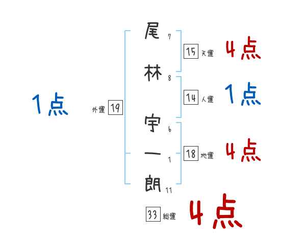 外運![]() | 尾林宇一朗さんの外運は19画の1つ星!優れた才能を持ちますが、協調性が足りないことも。周りの人と協力する事を意識しましょう。 生活面を象徴する運勢です。外部から受ける影響力を表し、結婚運、家庭運や職場、環境への順応性を表します。 |