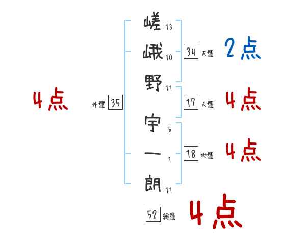 外運![]() | 嵯峨野宇一朗さんの外運は35画の4つ星!温厚な性格で感受性が高い。穏和な性格で人望が厚い。 生活面を象徴する運勢です。外部から受ける影響力を表し、結婚運、家庭運や職場、環境への順応性を表します。 |