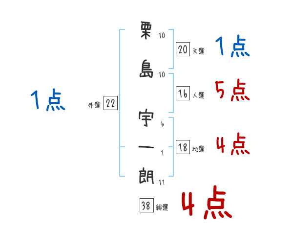 外運![]() | 栗島宇一朗さんの外運は22画の1つ星!努力することが苦手ないっぽう手先が器用。芸術性にも優れる。 生活面を象徴する運勢です。外部から受ける影響力を表し、結婚運、家庭運や職場、環境への順応性を表します。 |