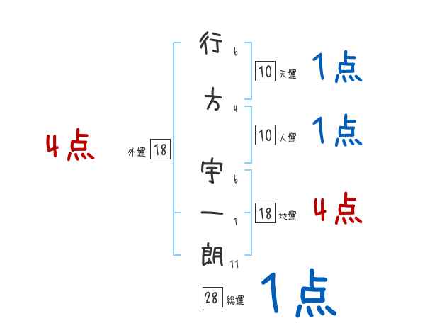 外運![]() | 行方宇一朗さんの外運は18画の4つ星!情熱的で剛気。忍耐力があり信頼される。 生活面を象徴する運勢です。外部から受ける影響力を表し、結婚運、家庭運や職場、環境への順応性を表します。 |