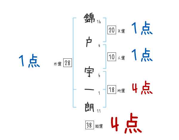 外運![]() | 錦戸宇一朗さんの外運は28画の1つ星!家庭環境に注意。スポーツで活躍できる能力があるかも。 生活面を象徴する運勢です。外部から受ける影響力を表し、結婚運、家庭運や職場、環境への順応性を表します。 |