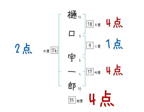 天運![]() | 樋口宇一郎さんの天運は18画の4つ星!情熱的で剛気。忍耐力があり信頼される。 家系が持つ宿命的な運勢を表します。祖先から受け継いだ苗字ですので自分の力が及びません。家柄を象徴します。 |