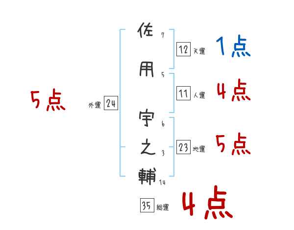 天運![]() | 佐用宇之輔さんの天運は12画の1つ星!簡単な失敗で諦めてしまいやすいかも。着実に行動すると良いでしょう。 家系が持つ宿命的な運勢を表します。祖先から受け継いだ苗字ですので自分の力が及びません。家柄を象徴します。 |