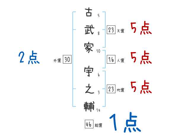 天運![]() | 古武家宇之輔さんの天運は23画の5つ星!想像力に優れ活力がある。一代で成功し名誉を手に入れる。 家系が持つ宿命的な運勢を表します。祖先から受け継いだ苗字ですので自分の力が及びません。家柄を象徴します。 |