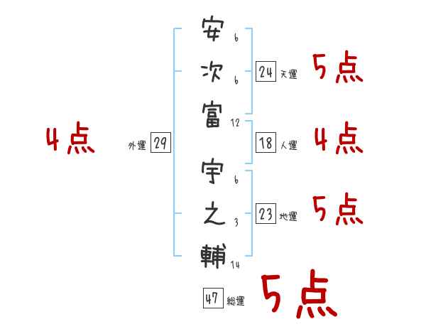 天運![]() | 安次富宇之輔さんの天運は24画の5つ星!家庭運が良く順調な人生。金運にも恵まれる。 家系が持つ宿命的な運勢を表します。祖先から受け継いだ苗字ですので自分の力が及びません。家柄を象徴します。 |
