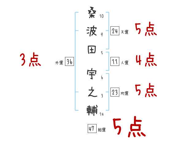 外運![]() | 桑波田宇之輔さんの外運は36画の3つ星!先見性が豊かです。多少神経質で苦労することも。 生活面を象徴する運勢です。外部から受ける影響力を表し、結婚運、家庭運や職場、環境への順応性を表します。 |