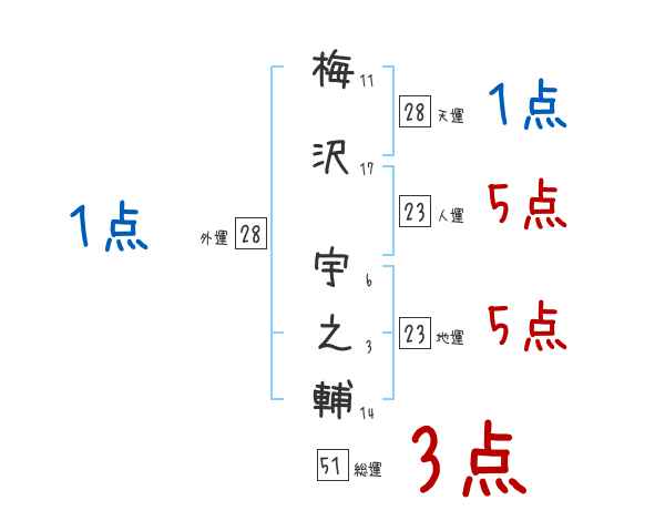 総運![]() | 梅沢宇之輔さんの総運は51画の3つ星!変化が激しく、危険に注意。堅実な性格。 あなたの人生を表す1番重要な運勢です。生涯を通じて影響する総合運となり、主に50歳以降の晩年期に影響を及ぼします。 |