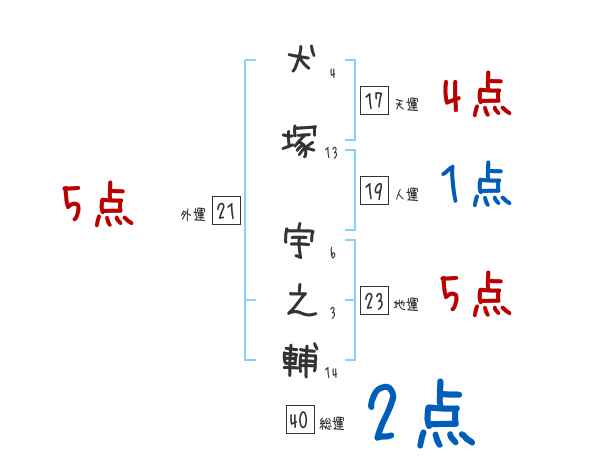 外運![]()  | 犬塚宇之輔さんの外運は21画の5つ星!統率力がある。独立し成功する。名誉を手に入れる。 生活面を象徴する運勢です。外部から受ける影響力を表し、結婚運、家庭運や職場、環境への順応性を表します。 |