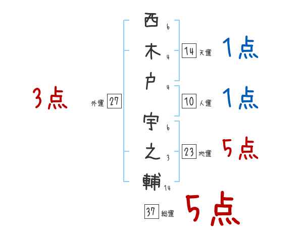 外運![]() | 西木戸宇之輔さんの外運は27画の3つ星!頭脳明晰だが強情で摩擦が多い傾向。孤立に注意。 生活面を象徴する運勢です。外部から受ける影響力を表し、結婚運、家庭運や職場、環境への順応性を表します。 |