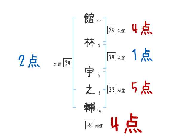外運![]() | 館林宇之輔さんの外運は34画の2つ星!独創性に優れるが、自尊心が強く災難に注意しましょう。 生活面を象徴する運勢です。外部から受ける影響力を表し、結婚運、家庭運や職場、環境への順応性を表します。 |