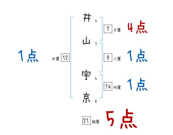 天運![]() | 井山宇京さんの天運は7画の4つ星!強い意志や信念を持ち独立心が強い。自立する。 家系が持つ宿命的な運勢を表します。祖先から受け継いだ苗字ですので自分の力が及びません。家柄を象徴します。 |