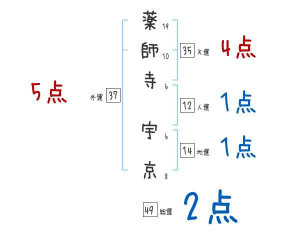 天運![]() | 薬師寺宇京さんの天運は35画の4つ星!温厚な性格で感受性が高い。穏和な性格で人望が厚い。 家系が持つ宿命的な運勢を表します。祖先から受け継いだ苗字ですので自分の力が及びません。家柄を象徴します。 |