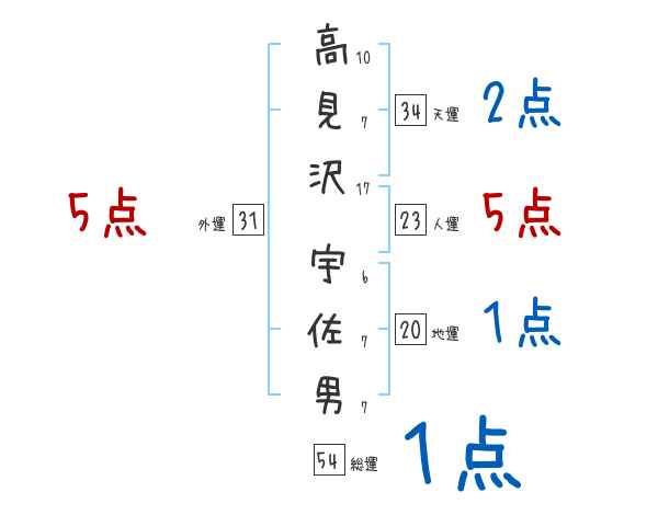 外運![]() | 高見沢宇佐男さんの外運は31画の5つ星!社交性があり判断力に優れる。順風満帆な人生で円満な生活。 生活面を象徴する運勢です。外部から受ける影響力を表し、結婚運、家庭運や職場、環境への順応性を表します。 |