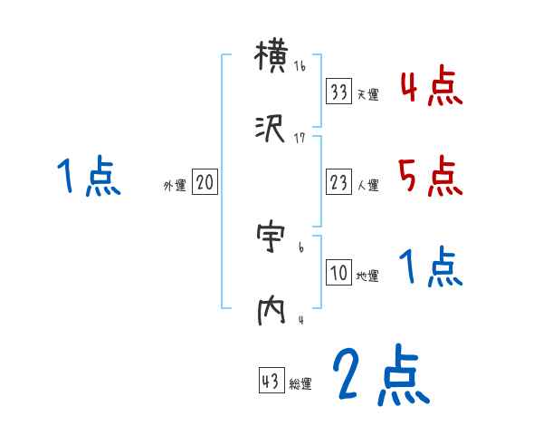 総運![]() | 横沢宇内さんの総運は43画の2つ星!頑固な性格で独立心が強いかも。やや非現実的で浪費に注意しましょう。 あなたの人生を表す1番重要な運勢です。生涯を通じて影響する総合運となり、主に50歳以降の晩年期に影響を及ぼします。 |