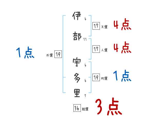 総運![]() | 伊部宇多里さんの総運は36画の3つ星!先見性が豊かです。多少神経質で苦労することも。 あなたの人生を表す1番重要な運勢です。生涯を通じて影響する総合運となり、主に50歳以降の晩年期に影響を及ぼします。 |